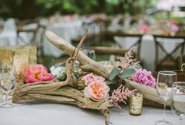 Three piece driftwood arch or cross , silk flower sprays, white or off white chiffon drapery, up to 20 white resin chairs, ceremony table and site preparation around ceremony site.